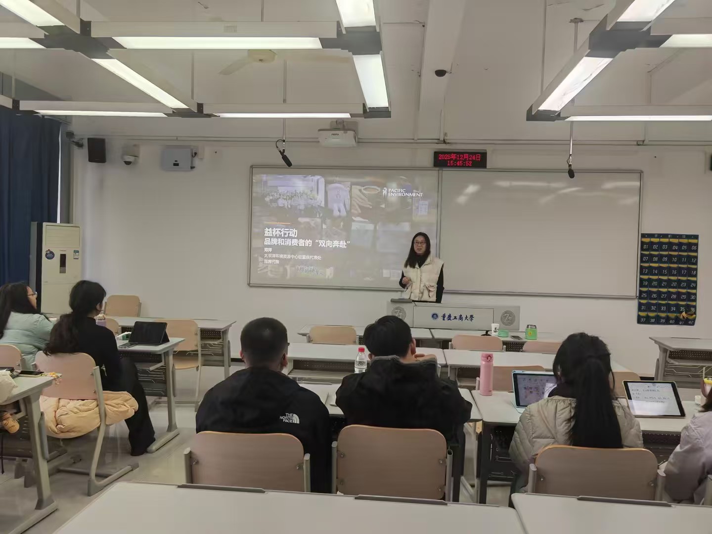 为促进课堂教学与实践教学的深度融合,拓展社会工作专业硕士(MSW)在环境治理领域的专业视野,2025年12月24日下午,我院《环境治理与社会工作研究专题》课程特邀太平洋环境资源中心驻重庆代表处首席代表邓萍女士,为2024级MSW学生开展了一场以“多元参与现制饮品行业减塑”为主题的移动课堂。本次课堂由授课教师程鹏立主持。