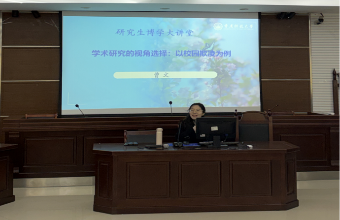 2026年3月10日,法学与社会学学院“研究生学术能力提升工作坊(第6期)”在重庆工商大学南岸校区慧智楼426顺利举行。本期工作坊邀请到了教育学博士、重庆科技大学马克思主义学院教师曹文作《学术研究的视角选择:以校园欺凌为例》主题讲座。法学系卢博老师,社会学系袁博老师、刘成晨老师、王茹薪老师以及20余名研究生聆听了讲座。此次工作坊由社会学系教师王文涛主持。