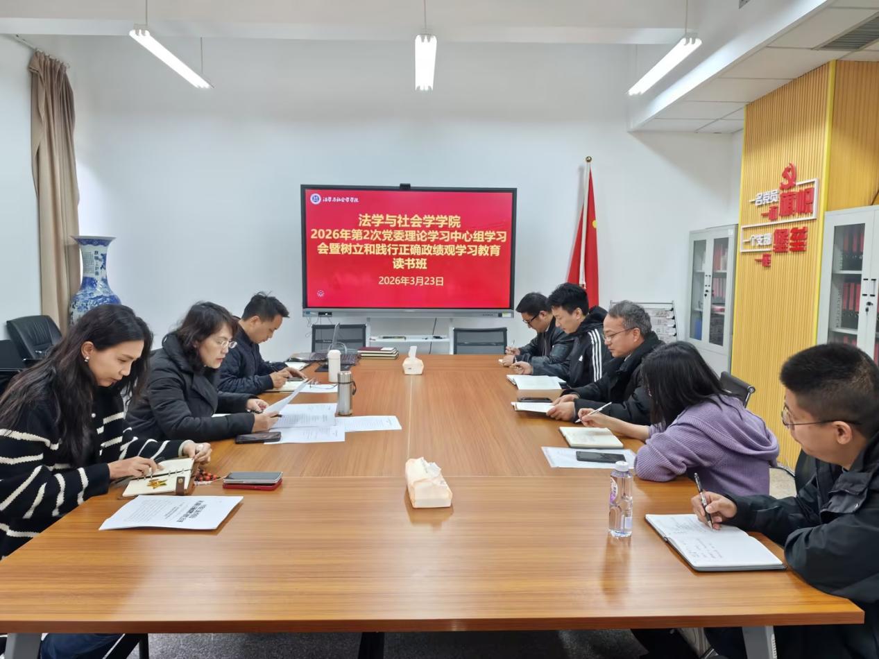 为深入学习贯彻习近平新时代中国特色社会主义思想,扎实推进树立和践行正确政绩观学习教育走深走实,3月23日,法学与社会学学院在慧智楼90407会议室召开2026年第2次党委理论学习中心组学习会暨树立和践行正确政绩观学习教育读书班。学院党委书记李莉莎主持会议,全体党政领导、党委委员参加学习。