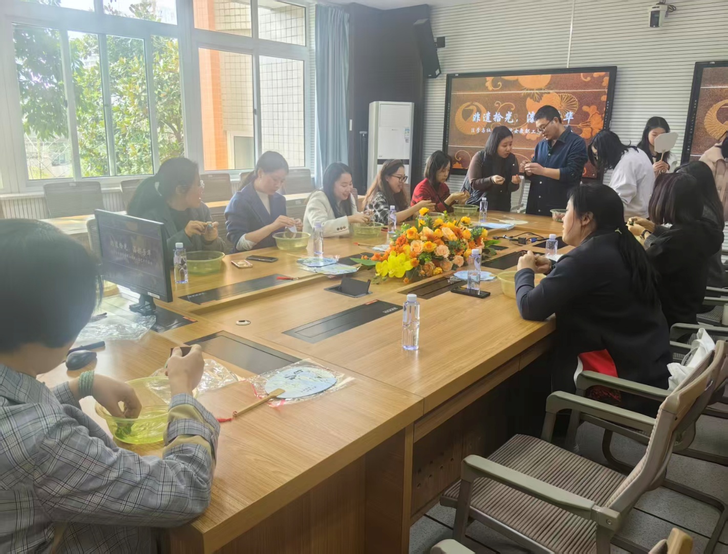 为丰富女教职工精神文化生活,传承中华优秀传统文化,法学与社会学学院工会于3月5日下午,在慧智楼90429会议室成功举办了“非遗拾光,漆彩芳华”女教职工漆艺手作体验活动。参加活动的教职工在九龙坡区非遗传承人刘志学的指导下亲手制作漆扇与漆葫芦,沉浸式感受非遗技艺的独特魅力与文化温度,在创作中舒缓身心,涵养雅趣。