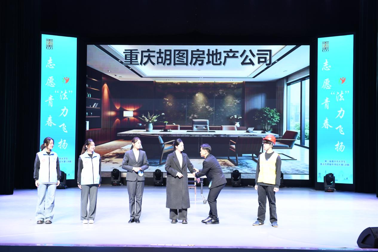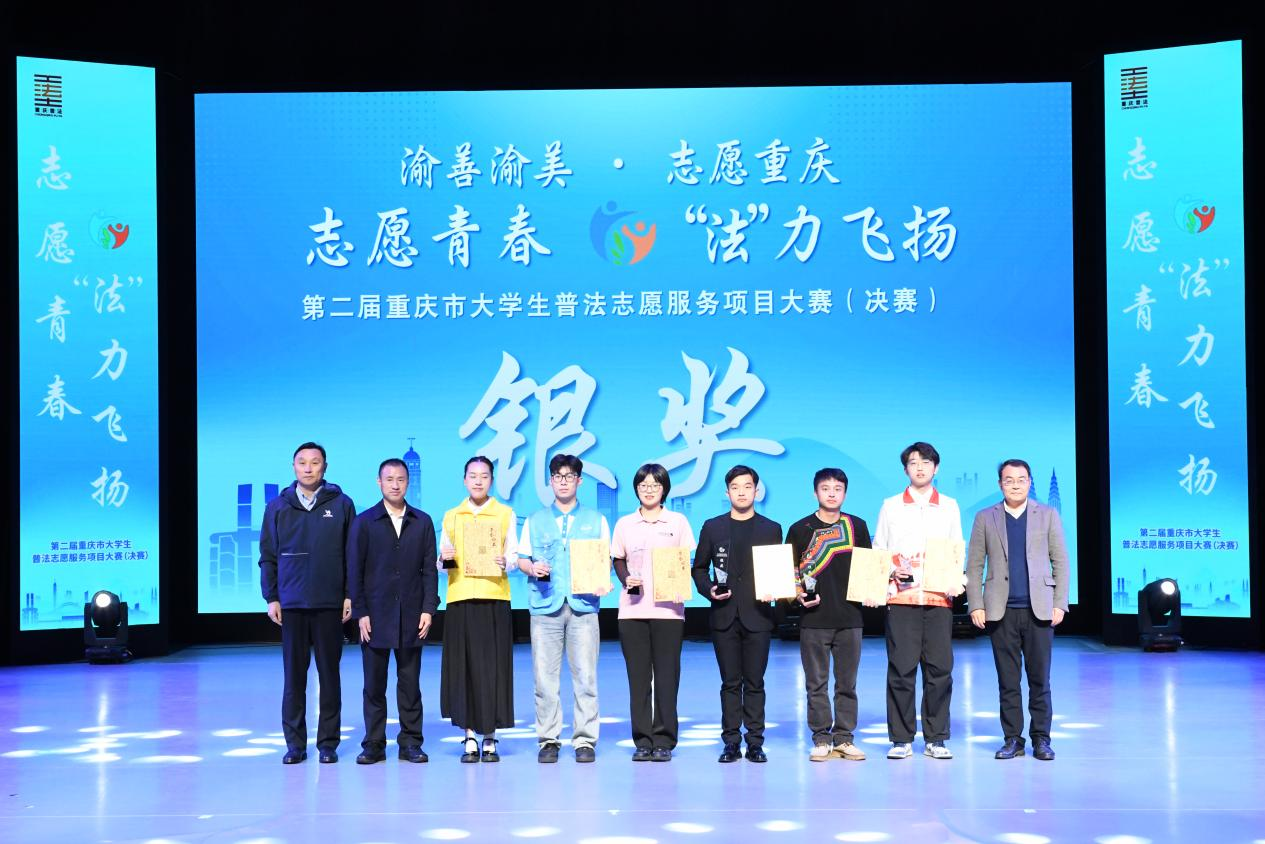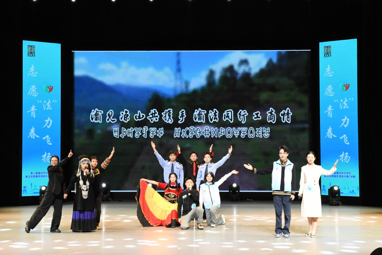 决赛现场,由法学与社会学学院分团委书记何祖润带队,20余名普法团队学生成员通力合作、密切配合,采取PPT汇报、情景剧、普法歌舞表演等形式进行项目展示,将法律知识转化为群众听得懂、用得上的“法治大餐”。最终,“渝法惠企”项目与“渝见凉山”项目以全市第6名、第7名的优异成绩斩获银奖2项。
