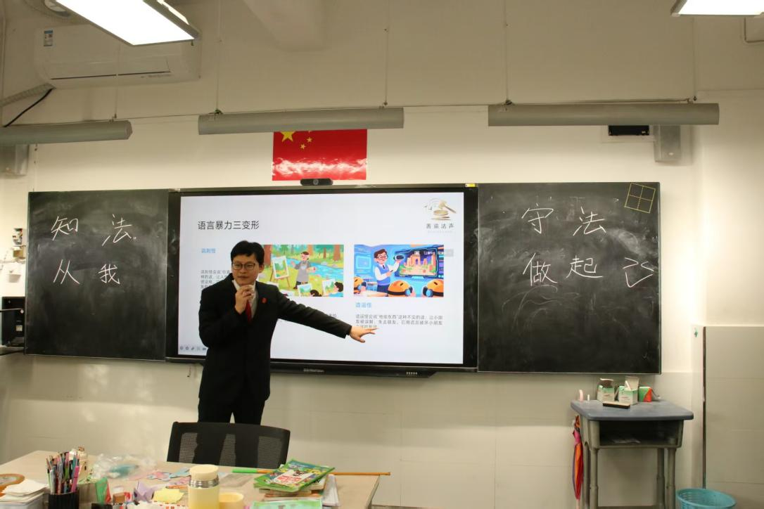 11月21日下午,法学与社会学学院律动青年法学社联合学院共建单位巴南区人民法院共同走进江南小学,为一年级学生开展了“知法守法,从我做起”主题普法课程活动。