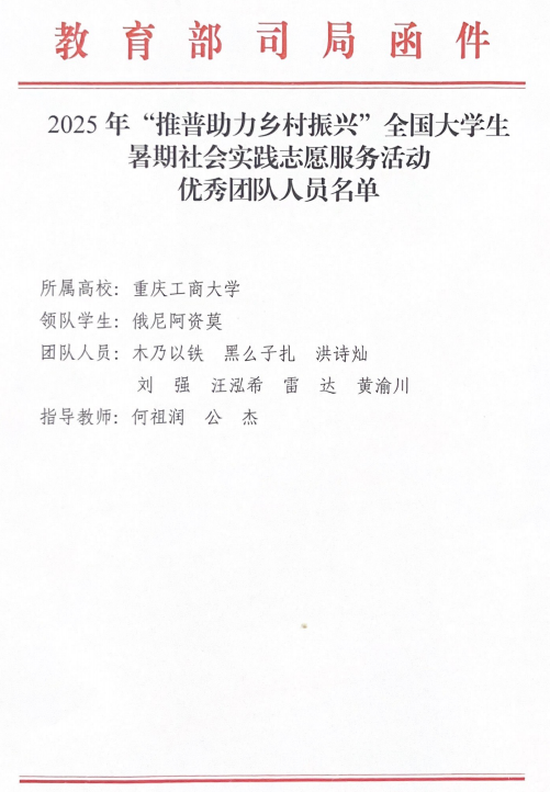 2025年12月,团队收到来自教育部、团中央的表扬信,高度赞扬了团队在实践过程中的突出表现,授予“渝见凉山”民族地区推普法律援助团优秀团队称号。未来,法学与社会学学院将进一步深化“渝见凉山”民族地区援助项目,将普通话推广、法律援助、捐资助学等多维度公益服务送进大凉山。