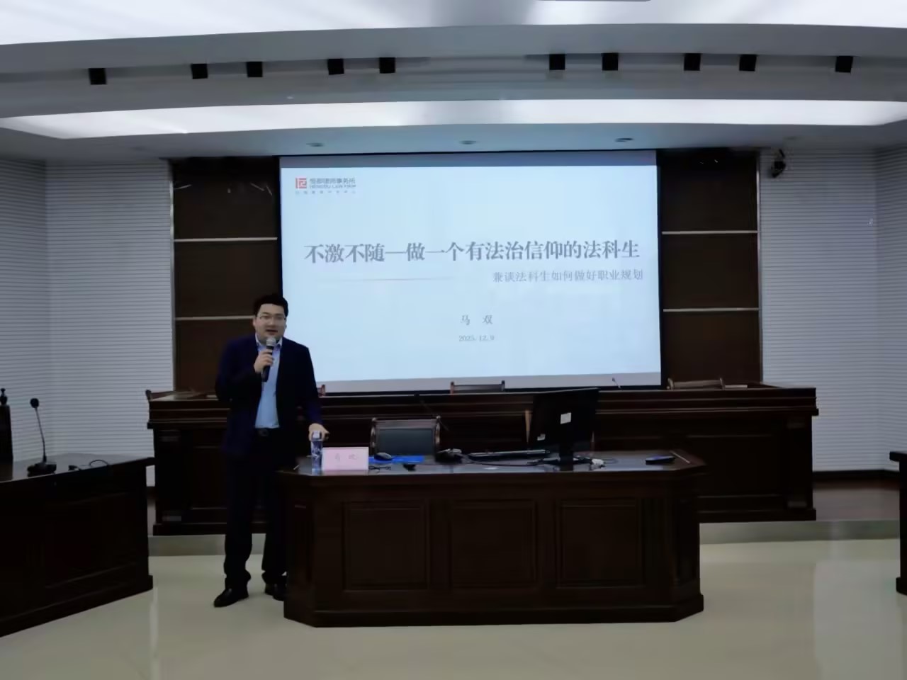 本次讲堂邀请到我校校友、北京恒都(南京)律师事务所管委会主任、高级合伙人马双主讲,学校校友会副主任王小玲,法学与社会学学院党委书记李莉莎、副院长张琨蓓、系主任公杰,以及学院法学专业本科、研究生新生等参加。活动由公杰主持。