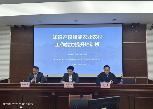 11月5日,由重庆市知识产权局主办,重庆工商大学法学与社会学学院、重庆市农产品加工业协会共同承办的“知识产权赋能农业农村工作能力提升培训班”在重庆工商大学慧智楼90426开班。培训采取线上线下相结合的方式,来自知识产权、农业农村、农产品及食品加工业80余个单位的110余名相关人员参加了线下培训,线上累计学习人数达到2000余人次。知识产权局公共服务处专利代办处副处长胡尊爽,重庆工商大学法学与社会学学院院长刘勇参加了开班仪式。开班仪式由重庆工商大学法学与社会学学院副院长侯明喜主持。
