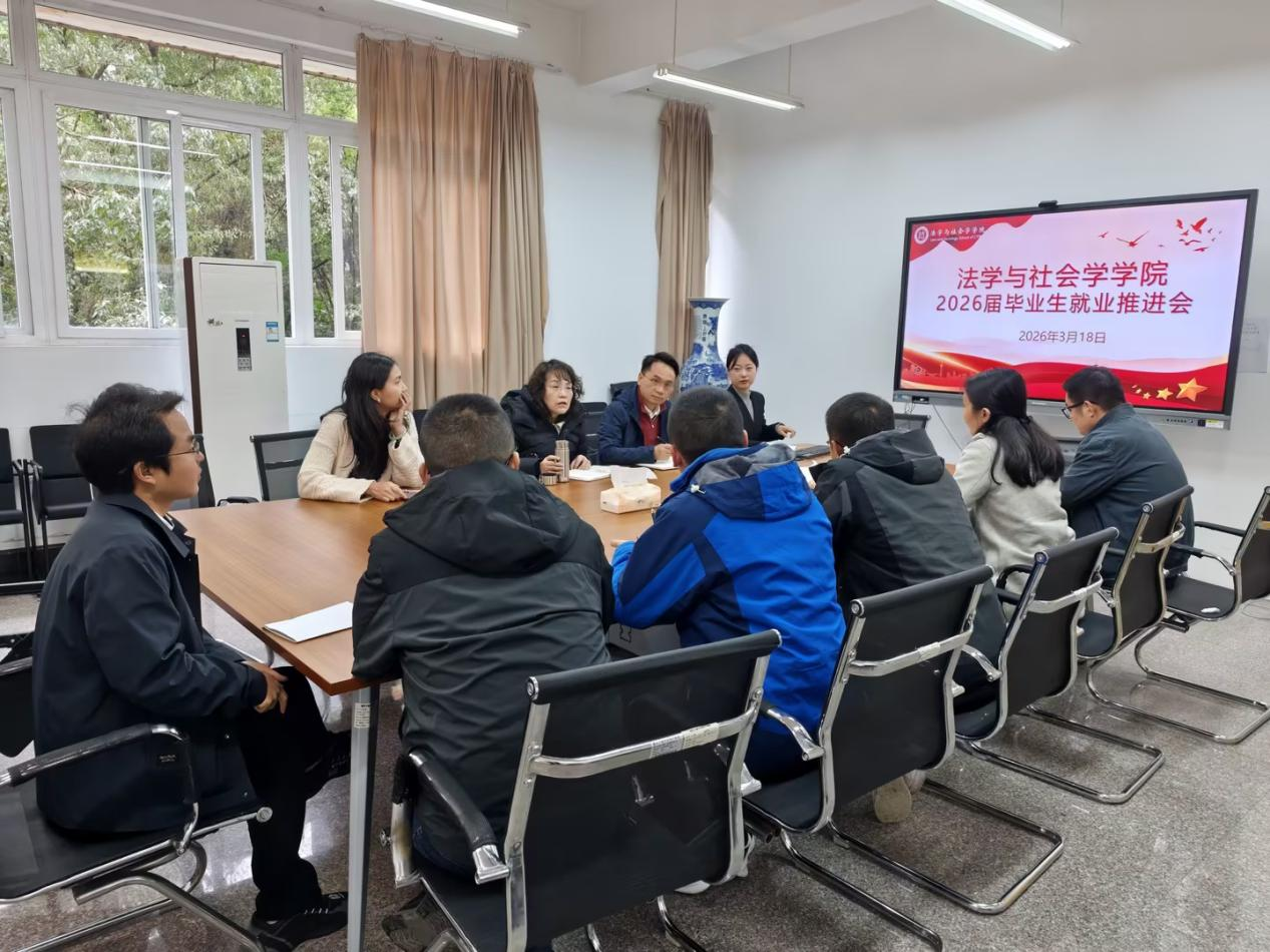 为进一步落实学校关于毕业生就业工作的部署要求,抢抓春季促就业工作关键期,精准施策,全力推进2026届毕业生更充分、更高质量就业,法学与社会学学院于3月18日上午在慧智楼407会议室召开2026届毕业生就业工作推进会。学院班子成员、系主任、就业联络员及全体毕业班辅导员参加会议。
